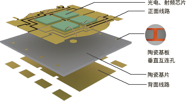 薄膜電路陶瓷封裝基板是一種通過(guò)磁控濺射薄膜金屬化與電鍍制程的技術(shù):即根據(jù)應(yīng)用需要,在高導(dǎo)熱的陶瓷基體上,采用薄膜金屬化及影像轉(zhuǎn)移方式制作2D金屬線(xiàn)路,然后采用TCV(Through Ceramic Via) 技術(shù)形成雙面布線(xiàn)間的垂直互連,最后采用堆疊技術(shù)獲得與陶瓷基體結(jié)合緊密的一體式3D金屬框架?;诒∧る娐饭に?,通過(guò)磁控濺射實(shí)現(xiàn)陶瓷表面金屬化,通過(guò)電鍍實(shí)現(xiàn)銅層和金成的厚度大于10微米以上即DPC(DirectPlateCopper-直接鍍銅基板)。