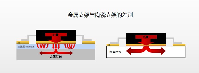 鋁支架:金屬支架的一種,金屬本身具有良好的導(dǎo)熱能力,但是因?yàn)榻饘俦旧韺?dǎo)電,無法做到電熱分離,相對于陶瓷基板來講還需要多一道絕緣工藝。且由于有絕緣層這個(gè)“豬隊(duì)友”,金屬支架的散熱性能也就比塑料高一些。如果用在汽車大燈的時(shí)候就需要比較好的散熱設(shè)計(jì)進(jìn)行匹配,不然的話,結(jié)溫依然會很高,結(jié)溫高了就會導(dǎo)致光衰,時(shí)間長了大燈的亮度就會急劇衰減。并且散熱設(shè)計(jì)中的風(fēng)扇散熱器等成本會高很多,同時(shí)還占據(jù)了更多的空間。