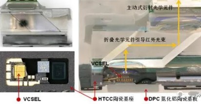 根據(jù)有關(guān)拆解圖片來看,VCSEL芯片安裝在一塊氮化鋁原料的DPC陶瓷基板上,氮化鋁基板又貼裝于一個(gè)HTCC陶瓷基座底部。