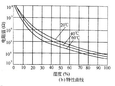 濕度傳感器的結(jié)構(gòu)如圖(a)所示,該傳感器的電阻值和濕度關(guān)系曲線如圖(b)所示。當(dāng)曲線上可知濕度加大時(shí),傳感器電阻值就會(huì)減小。