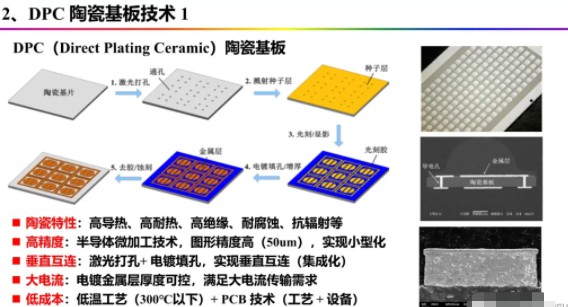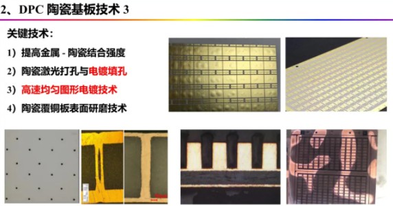 dpc就是直接電鍍陶瓷基板,可以看出來其制備工藝就是陶瓷片通過激光打孔,然后通過磁控濺射鍍膜是陶瓷表面金屬化,然后在采用半導(dǎo)體光刻顯影刻蝕,其包括圖形電鍍技術(shù)來制備線路層。