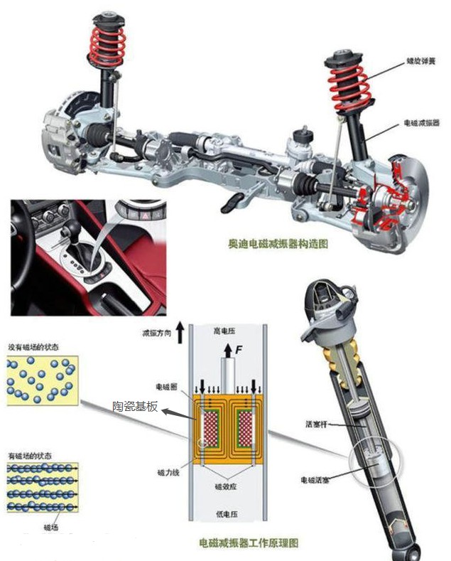 在高級(jí)轎車減振裝置是綜合氧化鋁陶瓷基板的正壓電效應(yīng)、逆壓電效應(yīng)和電致伸縮效應(yīng)而研制的智能減振器。由于采用了高靈敏度的氧化鋁陶瓷基板元件,減震器具有識(shí)別路面和自我調(diào)節(jié)的功能,可以最大限度地減少因路面不平造成的振動(dòng)。