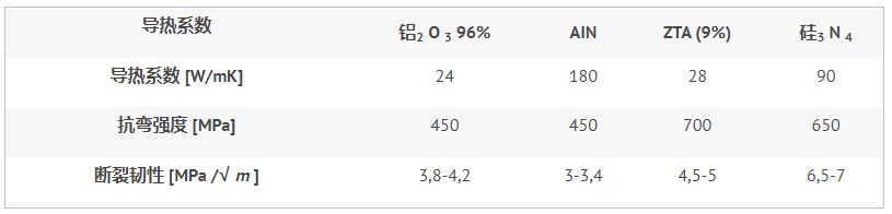 如表1所示,氧化鋁顯示出低熱導(dǎo)率和低機(jī)械值。然而,24W/mk的熱導(dǎo)率足以滿足當(dāng)今許多標(biāo)準(zhǔn)工業(yè)應(yīng)用的需求。氮化鋁的最大優(yōu)勢(shì)是180W/mk的非常高的熱導(dǎo)率,盡管只有中等的可靠性。這是由于斷裂韌性低且彎曲強(qiáng)度與氧化鋁相似的結(jié)果。