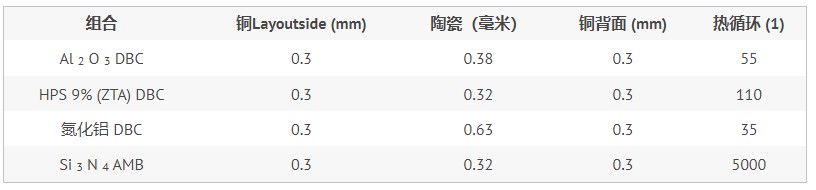 對(duì)更高可靠性的日益增長(zhǎng)的需求刺激了最近氧化鋯增韌氧化鋁陶瓷的發(fā)展。這些陶瓷顯示出顯著更高的彎曲強(qiáng)度和斷裂韌性。不幸的是,氧化鋯陶瓷的熱導(dǎo)率與標(biāo)準(zhǔn)氧化鋁處于同一范圍內(nèi),因此在具有最高功率密度的高功率應(yīng)用中用途有限。比較表明,氮化硅結(jié)合了高導(dǎo)熱性和高機(jī)械性能。熱導(dǎo)率可以指定為90W/mk,并且在比較陶瓷中具有最高的斷裂韌性(6.5– 7 [MPa / ])。這些特性導(dǎo)致人們期望氮化硅作為金屬化基板表現(xiàn)出最高的可靠性。