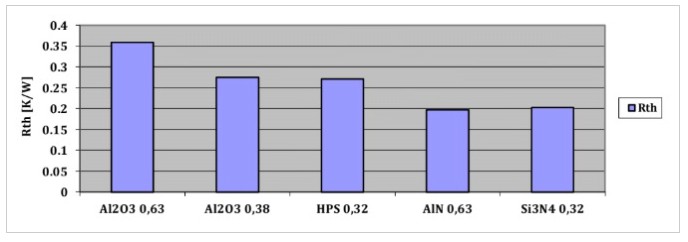 0.32 mm HPS 9% DBC 和 0.32 mm Al2O3 DBC 的 Rth 在同一范圍內(nèi)。盡管使用了 0.63 mm 厚的陶瓷層,但具有 180 W/mK 最高熱導(dǎo)率的 AlN DBC 具有最低Rth。Si3N4 的熱導(dǎo)率 (90W/mK) 是 AlN 的一半,這解釋了為什么 Si3N4 AMB 通過(guò)使用一半的陶瓷厚度(Si3N4 為 0.32 mm,AlN 為 0.63 mm)顯示出與 AlN DBC 相似的 Rth。