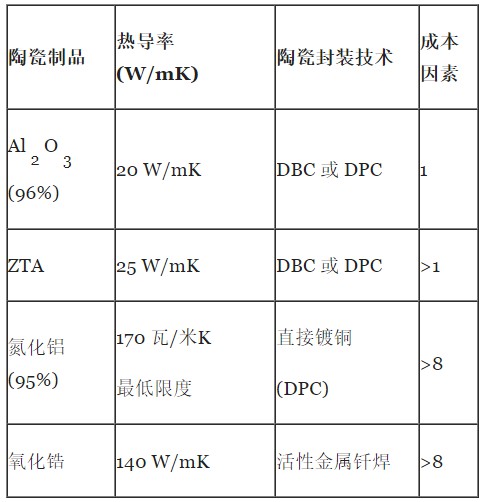 因此,封裝在功率半導(dǎo)體應(yīng)用中的主要作用之一是有效地從半導(dǎo)體器件中去除熱量,這也是最高功率器件采用成本更高的陶瓷封裝選項(xiàng)(例如直接鍵合銅(DBC)和直接鍍銅(DPC))的關(guān)鍵原因之一。對(duì)于這種類型的封裝技術(shù),厚銅(電鍍或銅箔)與氧化鋁96%、氮化鋁、氧化鋯增韌氧化鋁(ZTA)或氮化硅制成的陶瓷基板粘合。圖1列出了這些不同陶瓷材料的熱導(dǎo)率,以及相關(guān)陶瓷成本。