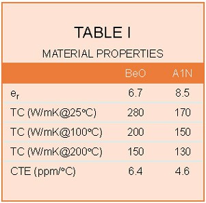 與氧化鈹陶瓷相比,氮化鋁陶瓷在許多方面都非常接近,由于應(yīng)用的高功率特性,主要關(guān)注的參數(shù)是熱導(dǎo)率,表1列出了兩種材料的特性。在電學(xué)上,氮化鋁具有比氧化鈹更高的介電常數(shù),這導(dǎo)致電容部分略高,必須采用仔細的布局和薄膜設(shè)計來減輕這種差異。