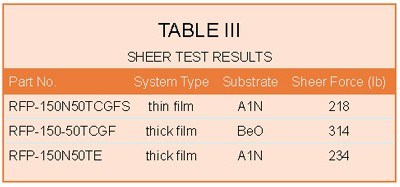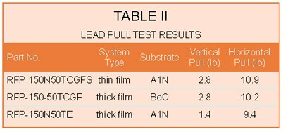 將0.050寬x0.006厚的銀帶引線焊接到三種部件上相同尺寸的導(dǎo)體焊盤上,然后將其拉至破壞,其平均結(jié)果列于表2中。所有三個系統(tǒng)的水平拉力都非常出色,而薄膜氮化鋁和厚膜氧化鈹?shù)拇怪崩y試似乎更好。