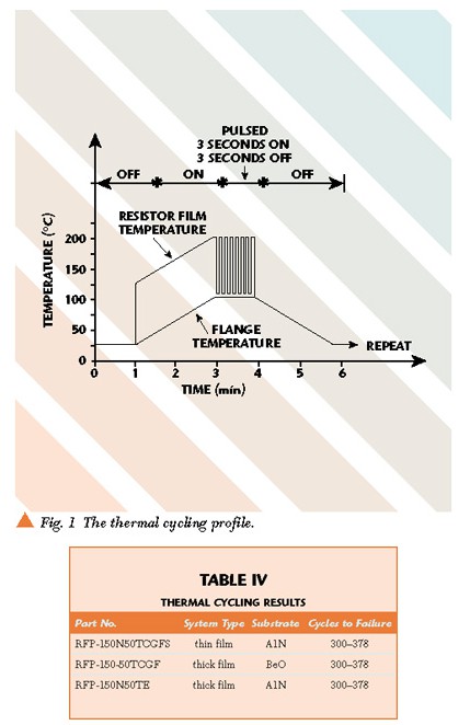 選擇銅法蘭材料和SN96焊料以提供對厚膜對陶瓷基板的長期粘附力的比較加速測量。銅的TCE是氮化鋁的TCE的3.6倍,SN96焊料的抗拉強度接近6000 psi。所有三個版本的零件都用螺栓固定在一個微處理器控制的冷卻板上,法蘭下方有少量導(dǎo)熱油脂。零件在100%的額定功率(DC)和最高法蘭溫度下循環(huán)使用。圖1所示的循環(huán)曲線旨在提供一個非常加速和惡劣的環(huán)境以加速故障。結(jié)果列于表4。