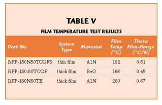 三個系統(tǒng)中的每一個的部件都安裝在溫度為100°C和耗散功率為150 W的受控散熱器上。薄膜溫度測量可以很好地指示終端的熱阻。使用紅外熱探頭進行薄膜溫度測量。結(jié)果列于表 5。正如預(yù)期的那樣,由于陶瓷的較低熱阻,BeO部分表現(xiàn)出較低的膜溫度。薄膜和厚膜AlN部分彼此相差幾度。