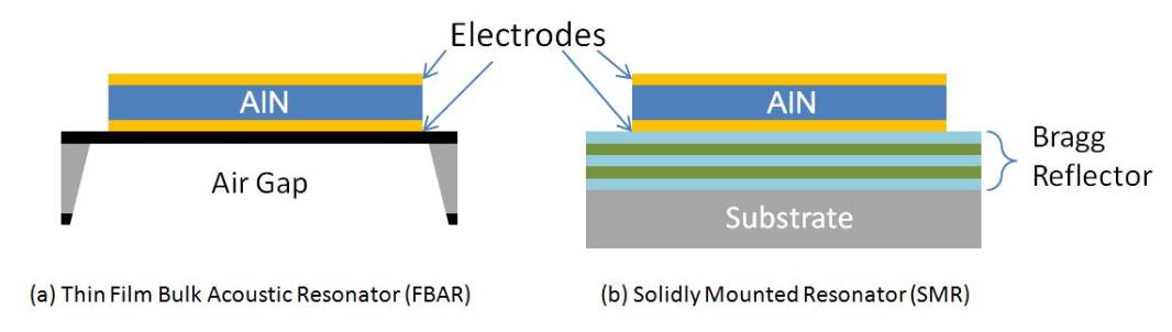 為了制造BAW濾波器,壓電氮化鋁層夾在兩個PVD沉積的金屬電極(例如Mo、W、AlCu)之間或者懸浮在蝕刻到襯底中的空腔上(即上圖a中的FBAR)或沉積到布拉格反射器堆棧(圖(b)中的 SMR)??涨缓投询B是反射縱向和剪切聲波的替代方法,這是避免基板損耗和提高諧振器“質(zhì)量”或“Q”因子所必需的。