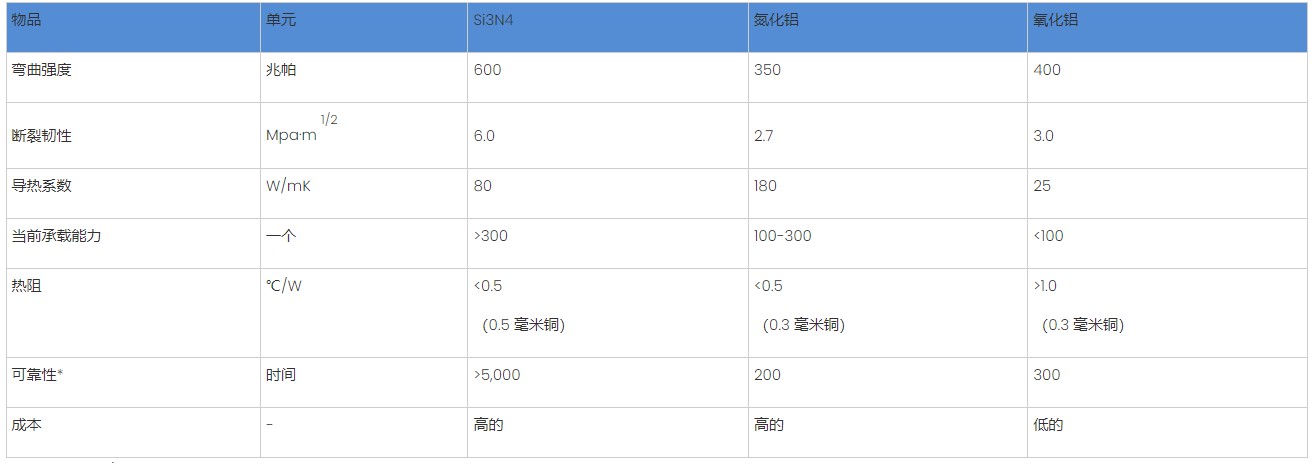 目前應用最廣泛的陶瓷基板材料主要是氧化鋁和氮化鋁。氮化硅與其性能相比如何?下表是三種陶瓷基板材料具有明顯的優(yōu)勢,尤其是氮化硅陶瓷基板材料在高溫條件下的耐高溫性能、對金屬的化學惰性以及超高的硬度和斷裂韌性等機械性能。