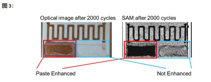 圖 3描繪了在 2000 次熱沖擊循環(huán)后具有漿料增強(qiáng)的 Cu 結(jié)構(gòu)和未增強(qiáng)的 Cu 結(jié)構(gòu)的基板的光學(xué)圖像和 SAM 測(cè)量值。即使經(jīng)過(guò) 2000 次循環(huán),增強(qiáng)部分實(shí)際上也沒(méi)有變化。