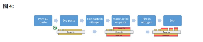 PE-DBC生產(chǎn)流程從標(biāo)準(zhǔn)dbc流程開始,在由以下三個(gè)步驟組成的厚膜工藝中連續(xù)增強(qiáng)蝕刻的dbc: