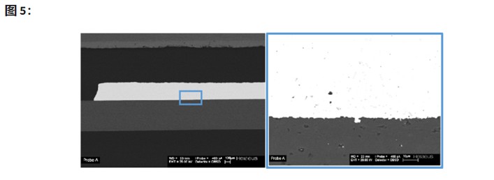 我們通過(guò)SEM分析了陶瓷與銅漿之間以及銅漿與銅箔之間的界面圖5,由于材料的致密燒結(jié),無(wú)法識(shí)別漿料和箔之間的界面。陶瓷和銅之間的界面是無(wú)空隙的。這對(duì)于基板的可靠性和局部放電特性非常重要。在銅層內(nèi)可以看到一些小的空隙,可以忽略不計(jì),對(duì)放電性能沒(méi)有影響。