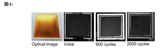總銅厚度約為 350 μm 和氧化鋁厚度為 630 μm 的2″×2″ PBC 基板經(jīng)受與相同的熱沖擊循環(huán)。圖6左側(cè)描繪了2000 次熱沖擊循環(huán)后基板的光學(xué)圖像。最初和 600 和 2000 次循環(huán)后,襯底的特征是SAM。最初可以看出,銅箔的邊緣沒(méi)有完美地結(jié)合到厚膜層上。這是由于當(dāng)時(shí)沒(méi)有優(yōu)化處理。600和2000 次熱沖擊循環(huán)后的SAM圖像表明,沒(méi)有發(fā)生額外的分層。