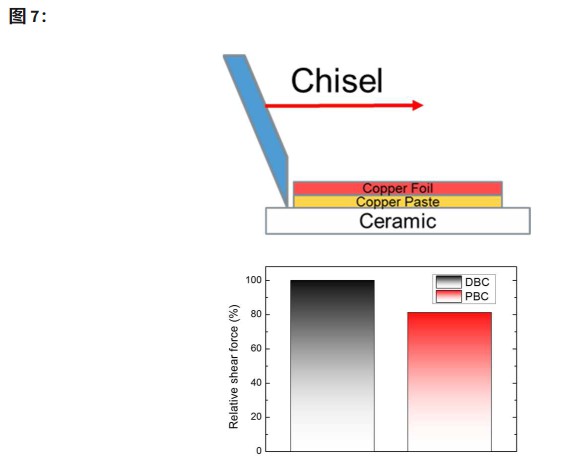 PBC 技術(shù)的附著力在 4×4 mm 2 Cu箔上進(jìn)行測(cè)試。使用剪切測(cè)試儀,測(cè)量鑿子剝離銅的最大力(圖7頂部)。與 DBC 相比,PBC 的最大作用力如圖 7所示。DBC 80% 以上的剪切力是由 PBC 實(shí)現(xiàn)的。