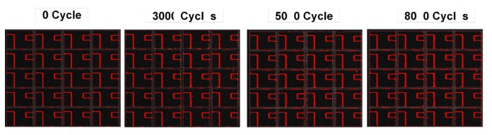 20個(gè)單獨(dú)的測(cè)試布局在熱沖擊測(cè)試之前和之后的SAM圖片(液體到液體-65℃到+150℃)。8000次循環(huán)后沒(méi)有明顯的退化,紅色表示蝕刻的隔離槽,它是測(cè)試布局的一部分。如果銅和釬焊金屬之間因熱沖擊而分層,紅色凹槽會(huì)變寬,這表明含銀AMB技術(shù)類似的方式充分利用Si3N4陶瓷的機(jī)械強(qiáng)度。