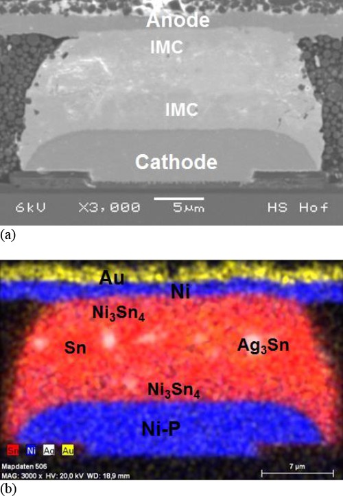 此后,對7個具有40μm焊料凸塊的芯片組件和5個具有30μm凸塊的組件進行了14KA/cm或25KA/cm的電遷移測試分別。到目前為止,40μm組件中有6個在7000小時后失效,而30μm組件在2500小時測試持續(xù)時間后沒有一個失效。用SEM和EDX對失效樣品進行的研發(fā)表明,微觀結(jié)構(gòu)在電流方面發(fā)生了不對稱的變化。發(fā)現(xiàn)在焊料中形成了幾種金屬間相。發(fā)現(xiàn)互連的主要損壞發(fā)生在與芯片的陰極接觸處;那里的Ni-P層顯示出典型的柱狀 Kirkendall 空洞,這是由Ni從層遷移到焊料中引起的。Ni-P和焊料之間的界面明顯發(fā)生了接觸失效。