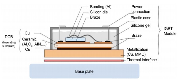 目前使用的高壓電力電子系統(tǒng)是基于一個基本的稱為“功率模塊”的磚,其中封裝了有源半導(dǎo)體。在這個組件中,人們發(fā)現(xiàn)了不同的材料,它們的功能是確保半導(dǎo)體與其環(huán)境之間的互連、絕緣和熱交換。電源模塊的簡化示意圖如圖1所示。