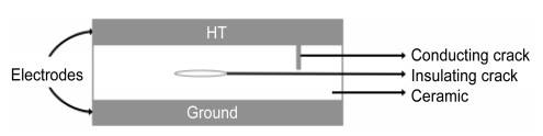 該假設(shè)在文獻中被描述為“機電介電擊穿”,基于該理論與脆性材料中的機械擊穿的類比。 在這樣的模型中,預(yù)先存在的裂紋或缺陷在外加電場的影響下傳播,直到最終擊穿(圖 2)。