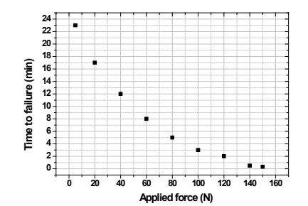 由于裂紋或裂紋網(wǎng)絡(luò)的形成減少了氧化鋁板的有效截面,如果施加恒定的力,實際應(yīng)力將隨著裂紋沿材料厚度的傳播而增加。最終裂紋尺寸將與其初始尺寸、施加的力和在這種力下花費的時間相關(guān)。進行了一系列測試以確定電氣擊穿之前的機械預(yù)應(yīng)力條件(力和應(yīng)用時間)。擊穿時間(機械)與施加力的特性如圖5所示。