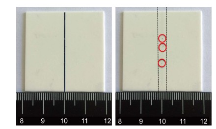 圖7介電分解的氧化鋁樣品。 頂面經(jīng)受壓縮(黑線,氈尖筆),底面經(jīng)受拉應(yīng)力。 紅色圓圈表示氧化鋁表面上的破裂通道出口點。