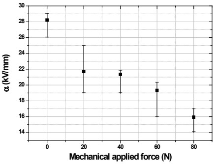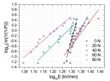 盡管這些值存在顯著差異,但我們可以觀察到氧化鋁在受到機械預(yù)應(yīng)力時的介電強度下降。隨著機械預(yù)應(yīng)力值的增加,α參數(shù)的降低更為重要。Ebr 值差異很大的原因之一可能源于我們。