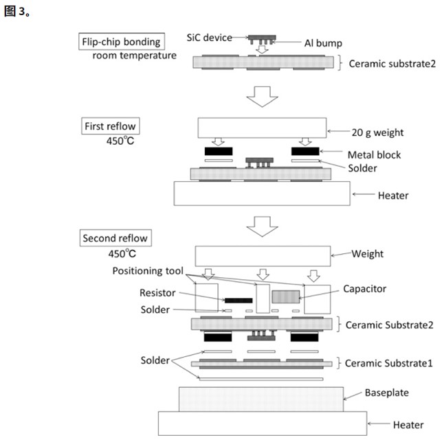 圖3顯示了三步模塊制造過程,在第一步,SiC器件在室溫下通過構(gòu)建在SiC器件上的AI凸塊倒裝芯片鍵合到陶瓷襯底。第二步中,金屬塊在真空室中用熔化溫度為356℃的Au-Ge共晶焊料焊接。真空室的溫度設(shè)置為450℃,以確保焊料潤濕良好。此外,在樣品上設(shè)置20克重物以幫助焊料潤濕。最后,將構(gòu)成緩沖電路的陶瓷基板和無源元件在真空室中一次性焊料。通過由碳制成的定位工具將緩沖電路放置在所需位置。該工藝中使用的焊料也是Au-Ge共晶焊料。