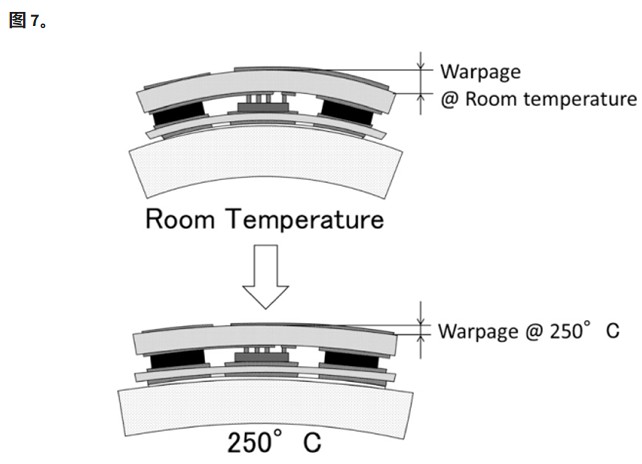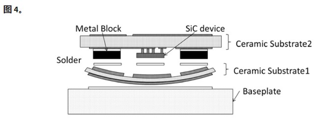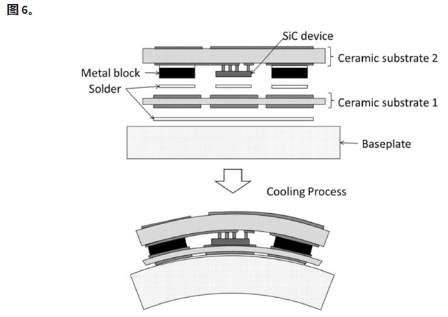 在制造過程中的冷卻過程中,模塊會發(fā)生如圖6所示的翹曲。這種翹曲是由陶瓷基板和基板之間哦CTE不匹配引起的,可以通過使用具有與陶瓷基板相似的CTE的基板材料來減少它。