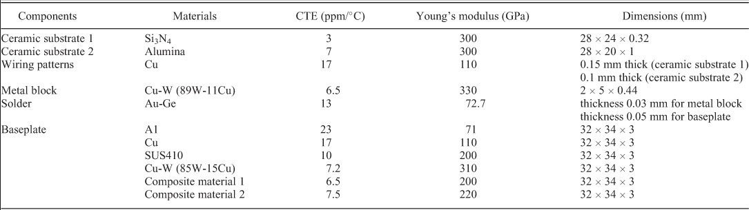 使用有限元法(FEM)進行模擬以估計模塊的近似翹曲。ANSYS Mechanical用作仿真工具。在模擬中,將356°C定義為無應(yīng)力溫度,將室溫定義為22°C。模擬中使用的部件的材料特性和尺寸如表一所示。為了確認結(jié)果,還模擬了其他基板材料。模擬了另一種典型的基板材料Al;它的CTE比Cu大。還模擬了復(fù)合材料Cu-W和復(fù)合材料1和2。這些復(fù)合材料的CTE 可以在一定程度上進行控制,以匹配陶瓷基板的CTE。