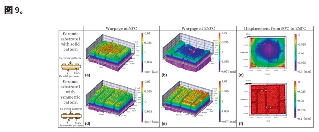 當基板加熱到250℃時會發(fā)生向下翹曲(圖 9b))由于基板每一側(cè)的Cu體積不平衡。在50℃和250℃之間具有實心圖案的基板的位移約為90μm(圖9c)。另一方面,兩側(cè)具有對稱布線圖案的基板在50℃和250℃均未顯示翹曲,并且位移小于10μm(圖9d-f)。通過在陶瓷基板的兩側(cè)采用對稱布線圖案,從50℃到250℃的翹曲位移減少到在一側(cè)具有實心圖案的陶瓷基板的九分之一或更小。在制造過程中,陶瓷基板的焊接溫度為356℃,遠高于250℃。沒有對策的陶瓷基板在356℃時的翹曲時間估計為140μm。