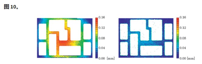 從50°C到250°C的位移是使用DIC通過參考50°C時的翹曲來測量的。結(jié)果如圖13所示,該圖還顯示了50°C和250°C時的翹曲。50°C和250°C之間的位移是通過從50°C 時的翹曲減去250°C的翹曲獲得的。