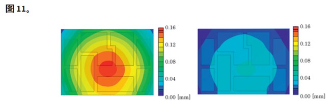 圖11顯示了以下條件下的模擬結(jié)果。初始條件為356°C無應(yīng)力,這是Au-Ge共晶焊料的熔化溫度。通過冷卻至室溫來模擬翹曲。通過測定陶瓷基板2的上表面的位移來評價翹曲。圖11a和11b分別顯示了使用Cu和SUS410基板的模塊的模擬結(jié)果。確認模擬結(jié)果顯示出與測量結(jié)果相同的趨勢。