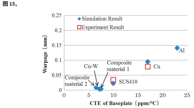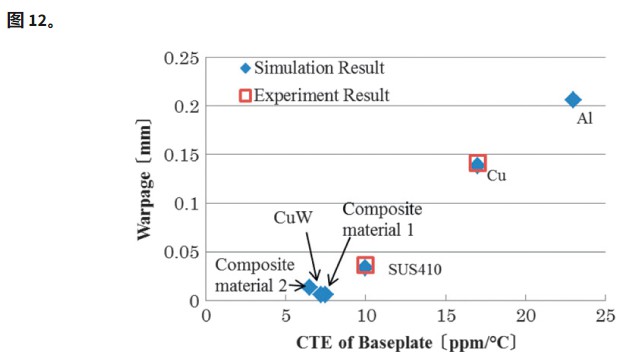圖12所示比較模擬和測量結(jié)果。橫軸是底板的CTE,縱軸是模塊的翹曲度。此外,還模擬了使用 Al、Cu-W 和復(fù)合材料基板(如表 I所示)的模塊。仿真結(jié)果與測量結(jié)果吻合良好。因此,可以預(yù)測具有不同基板材料的模塊中發(fā)生的翹曲。使用CTE為6–7 ppm/°C的基板(例如Cu-W和復(fù)合材料)的模塊的翹曲預(yù)計最小。這與陶瓷基板1和2的表觀 CTE非常吻合。另一方面,由于其較大的 CTE,預(yù)計鋁基板在這些材料中具有最大的翹曲。