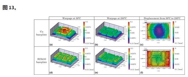 使用Cu基板的模塊在50℃時的翹曲(圖13a)主要反映了陶瓷基板2的Cu布線圖案,模塊呈現(xiàn)向上翹曲,這與室溫下的激光顯微鏡測量結(jié)果一致。使用SUS410基板的模塊在50°C 時的翹曲(圖13d)也與激光顯微鏡測量結(jié)果一致。將溫度提高到250°C顯著減輕了使用銅基板的模塊的翹曲(圖13b)。