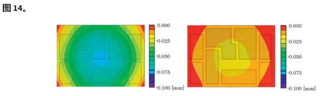 模擬的翹曲位移如圖14所示。初始條件在室溫下是無應(yīng)力的。通過將溫度升高到 250°C 來模擬翹曲。如上所述,這些條件用于獲得兩個溫度之間的位移,但不能用于獲得絕對翹曲。評價了陶瓷基板的上表面的翹曲。