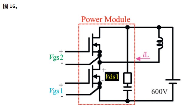 使用應(yīng)用了對策的功率模塊進行了雙脈沖測試(圖8 )。測試在加熱到225°C的熱板上進行。模塊的等效電路如圖16所示。