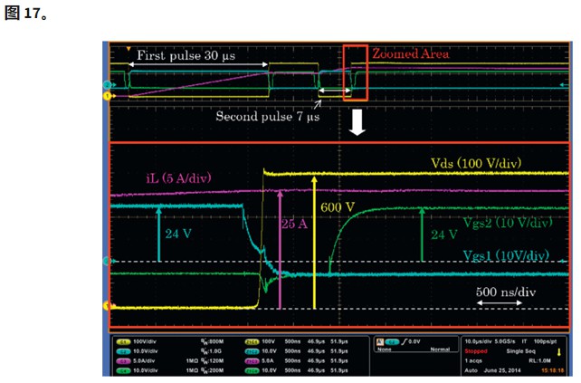 設(shè)定為600 V,雙脈沖測試的波形如圖17所示。第一個脈沖寬度為30 μs,第二個脈沖寬度為8 μs。電流設(shè)置為25 A。觀察到20 ns 的電流下降時間和50 V 浪涌電壓。通過擬合結(jié)果,模塊的雜散電感估計為5 nH。該測試結(jié)果證實該模塊可以在225°C下運行,高于硅器件的極限。