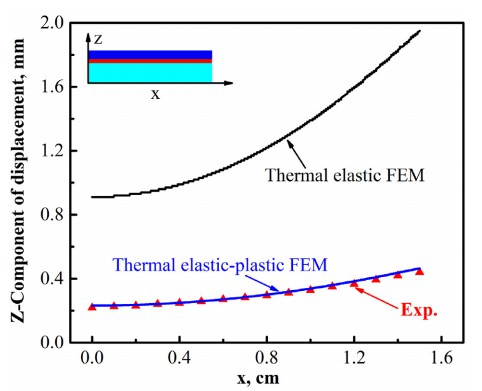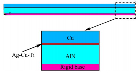 其中,Es和γs分別是楊氏模量和泊松比基材,ts和tf分別代表基板和薄膜的厚度。該公式的準(zhǔn)確條件之一是薄膜比基材薄得多。然而,在本文中金屬層厚度與陶瓷基板的厚度比較接近,在冷卻過程中金屬會(huì)發(fā)生塑性變形。當(dāng)基板的厚度接近薄膜時(shí),或在殘余應(yīng)力作用下的結(jié)構(gòu)發(fā)生較大變形時(shí),都會(huì)影響殘余應(yīng)力結(jié)果的準(zhǔn)確性。在這里殘余應(yīng)力是使用有限元法(FEM)計(jì)算的,以確保結(jié)果的準(zhǔn)確性。