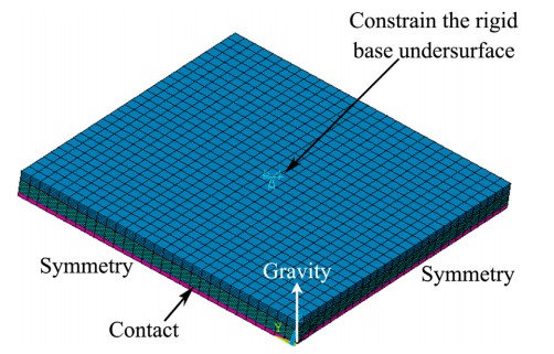 模型采用3D彈塑性有限元分析方法。使用8節(jié)點(diǎn)對(duì)模型進(jìn)行網(wǎng)格劃分,在模擬中過程中,對(duì)模型施加的約束如圖2所示。將樣品和剛性底座設(shè)置為接觸對(duì),使樣品可以自由彎曲。采用1/4對(duì)稱模型來簡(jiǎn)化有限元計(jì)算。