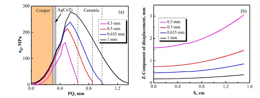 當(dāng)陶瓷厚度增加,殘余應(yīng)力分布保持不變基本不變,但峰值應(yīng)力增加。很明顯陶瓷厚度越大,軸向應(yīng)力越大。此外,可以看出軸向應(yīng)力是拉伸的,如圖6b所示陶瓷厚度與z分量的關(guān)系。沿MN路徑的位移,需要注意X定義為長(zhǎng)度從M到N,表明隨著陶瓷厚度的增加,整體翹曲逐漸減小。從圖6(a)和圖6(b)可以看出,對(duì)應(yīng)陶瓷厚度的最大軸向殘余應(yīng)力0.3mm、0.5mm、0.635mm和1mm分別為161 MPa、215 MPa、239 MPa和278兆帕。分別對(duì)應(yīng)陶瓷厚度0.3 mm、0.5 mm、0.635 mm和1 mm的最大軸向位移分別為3.165毫米、1.47毫米、0.922毫米和0.376毫米。什么時(shí)候陶瓷厚度為0.3 mm,變形最大,相應(yīng)陶瓷基板的軸向應(yīng)力最小。
