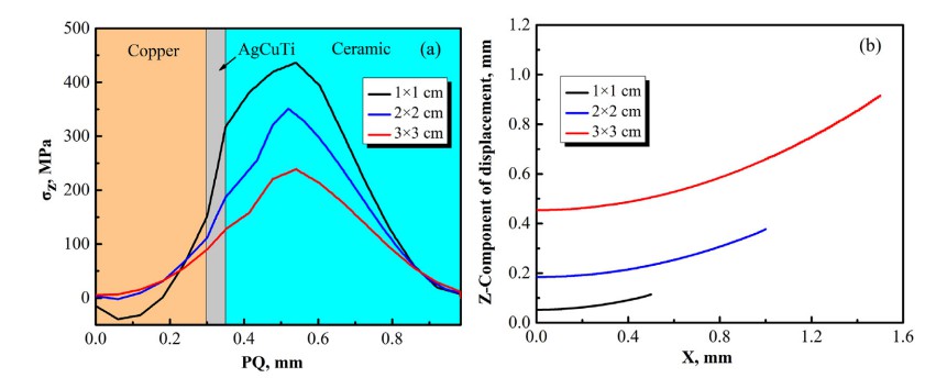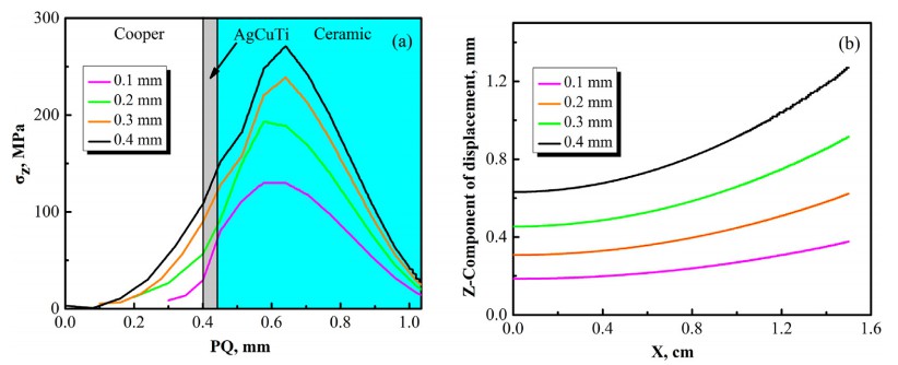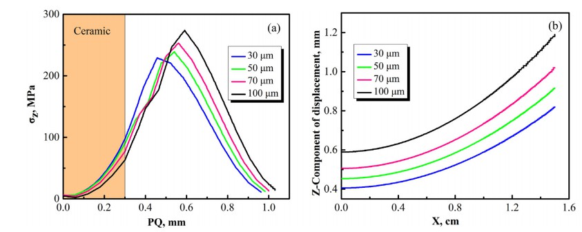 不僅影響軸向殘余應(yīng)力和翹曲變形,由材料的熱膨脹系數(shù)和尺寸決定的基板。不同陶瓷厚度的有限元模型模擬揭示了陶瓷厚度對(duì)翹曲變形和殘余應(yīng)力的有影響。銅膜厚度為0.3mm,Ag-Cu-Ti填充金屬層為50μm,面積為陶瓷基板保持不變。軸向殘余應(yīng)力和陶瓷基板的翹曲變形圖,厚度為0.635mm如圖5a和圖5b所示。從軸向殘差應(yīng)力圖,最大軸向應(yīng)力集中在陶瓷上邊??刹煌沾?/span>沿PQ路徑的σz分布厚度如圖6a所示。可以看出來,陶瓷厚度變化對(duì)最大σz有很大影響。