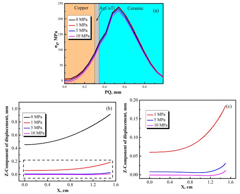 熱應(yīng)力的產(chǎn)生是一個(gè)積累的過程,界面的軸向殘余應(yīng)力和翹曲變形可通過在AMB陶瓷基板上施加一定的壓力來減少釬焊過程中,結(jié)果如圖9所示。隨著釬焊壓力,軸向殘余應(yīng)力的分布趨勢(shì)為基本不變,但施加的壓力越大,釋放界面的軸向殘余應(yīng)力。當(dāng)壓力為1 MPa時(shí),界面處的應(yīng)力與未施加壓力時(shí)相同。然而,在 10 MPa 基底壓力下,軸向殘余應(yīng)力降低到227 MPa。同時(shí),壓力不宜過大,否則會(huì)導(dǎo)致陶瓷破裂和焊料溢出。圖10(a)顯示了沿 PQ 路徑的 σz 分布,適用于不同的壓力基板。圖10(b)顯示了Z分量沿MN路徑和圖10(c)顯示了放大的區(qū)域。