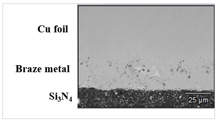 氮化硅陶瓷基板上的相形成和鍵合機制通過掃描電子顯微鏡(SEM)進行了表征,如圖1所示。實際的鍵合機制基于活性金屬(鈦)和Si之間的反應。氮化硅陶瓷形成穩(wěn)定的TiN層。由于Condura Ultra系統(tǒng)中不含銀,因此消除了典型的Ag相和Curich相,這在標準AMB技術(shù)中已知為使用含銀量高的釬焊填充金屬膏。然而,通過TiN反應層與氮化硅陶瓷基板的鍵合機制是相似的。