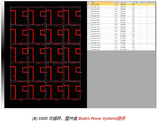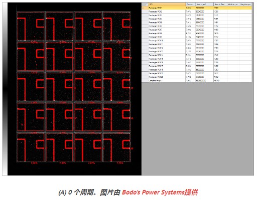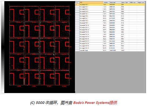 由于陶瓷的機械穩(wěn)健性,基于Si3N4的AMB陶瓷基板滿足最高的熱沖擊測試 (TST) 性能要求。評估Condura Ultra在Si3N4上的電阻與熱機械應力如圖2所示,使用內(nèi)部測試布局(30.6x29 mm2,0.5 mm Cu在0.32 mm陶瓷上)進行熱沖擊測試。測試前Condura Ultra基板的狀態(tài)通過掃描聲學顯微鏡 (SAM) 和如圖2左側(cè)所示。紅色表示蝕刻的隔離槽,它是所用測試布局的一部分。如果銅和釬焊金屬/陶瓷之間因熱沖擊而分層,則SAM圖片中的紅色隔離槽會變寬。在3000和5000次熱沖擊循環(huán)后,SAM重新評估了基板的完整性。結(jié)果顯示在圖2的中間和右側(cè),說明在Condura Ultra的初始狀態(tài)和循環(huán)后的Condura Ultra之間隔離槽沒有明顯變寬,證明陶瓷和釬焊金屬之間沒有發(fā)生分層。這表明Condura Ultra技術(shù)可以充分利用Si的機械穩(wěn)健性Si3N4陶瓷,同AMB技術(shù)。