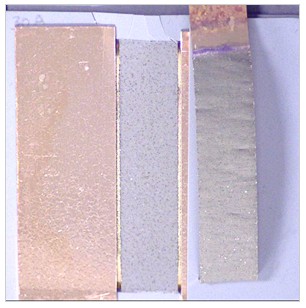 銅剝離強度表征銅箔對陶瓷的粘合強度。使用簡單的剝離測試,其中使用Condura Ultra技術(shù)將銅剝離條(10毫米寬x 0.3毫米厚)釬焊到一塊0.32毫米厚的Si3N4陶瓷上。剝離Cu并測量力。圖3顯示了剝離后剝離測試樣品的示例,該樣品的剝離強度平均為105 N/cm。剝離強度很大程度上取決于所測試的基材類型和技術(shù)。