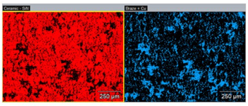 仔細檢查剝離樣品的失效模式可以提供有關粘合質(zhì)量的有價值的信息。圖3顯示了剝離測試后剝離的銅帶和剩余的基板對應物(右側(cè))。可以看到剝離條和對應物上的深色,表明從陶瓷基板中拉出Si3N4顆粒。這種失效模式也經(jīng)常出現(xiàn)在Si3N4 AMB陶瓷基板上。然而,Condura Ultra基板的反應區(qū)內(nèi)沒有出現(xiàn)故障。EDS相圖(圖4)證明了這一點,顯示剝離條上的大部分剩余材料源自Si3N4陶瓷而非釬焊金屬,這表明Condura Ultra工藝實現(xiàn)了強大的粘合機制。