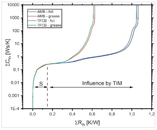 瞬態(tài)雙界面法用于評估金屬陶瓷基板的熱阻。二極管被燒結(jié)在AMB和Condura Ultra基板上,累積結(jié)構(gòu)函數(shù)通過在加熱組件后的冷卻曲線測量中計算得出,二極管的電流為40 A。R th然后通過檢測在不同邊界條件下測量的兩個結(jié)構(gòu)函數(shù)的發(fā)散點來評估系統(tǒng)的性能,即組件通過兩種不同的熱界面材料 (TIM) - 石墨箔和導熱油脂 - 連接到冷卻系統(tǒng)。得到的結(jié)構(gòu)函數(shù)如圖 5 所示。兩種基板類型的發(fā)散點相似,表明AMB陶瓷基板和 Condura Ultra 基板在初始狀態(tài)下的熱性能沒有差異。之后,Condura Ultra基材在175°C的高溫儲存(HTS)測試中老化1000小時,以對釬焊金屬施加應力并證明釬焊填充金屬系統(tǒng)是穩(wěn)定的。高溫超導后初始狀態(tài)和老化基板之間沒有觀察到差異,