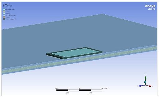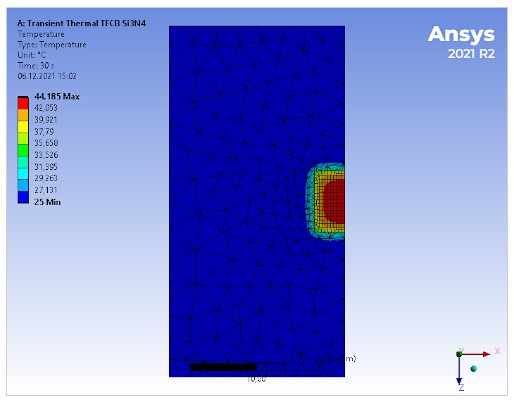 進行熱模擬以評估導熱率和陶瓷基板中釬焊金屬層的厚度對其總熱阻的影響。應用有限元法 (FEM)來包括熱擴散和其他幾何效應。對典型芯片基板設置的簡化幾何形狀進行了仿真,包括基板本身、陶瓷/Cu界面兩側(cè)的銅焊金屬層以及附有燒結(jié)銀芯片的硅芯片(圖6)。在模擬中,芯片在其體積內(nèi)以200 W的恒定功率加熱30秒,同時基板底部保持在25°C的恒定溫度。